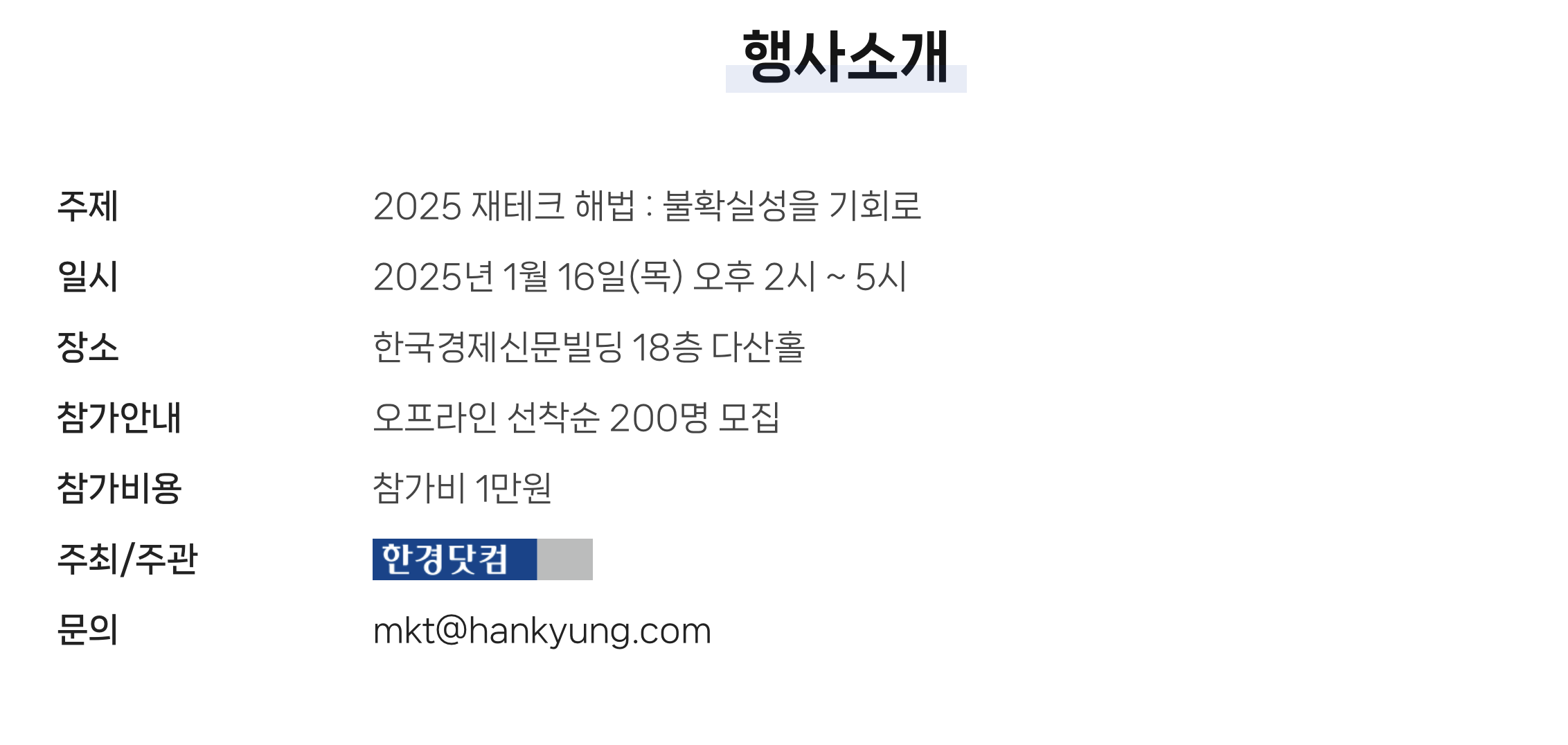 한경에서 주체하는 행사로 한국경제신문 빌딩 18층 다산홀에서 진행합니다. 오프라인으로 선착순 200명이며, 참가비는 1만원이 있어요. 카페에서 간단히 식사만해도 만원이 되니, 저렴한 가격에 인사이트를 얻어올 수 있지 않을까 싶어서 신청하게 되었습니다.