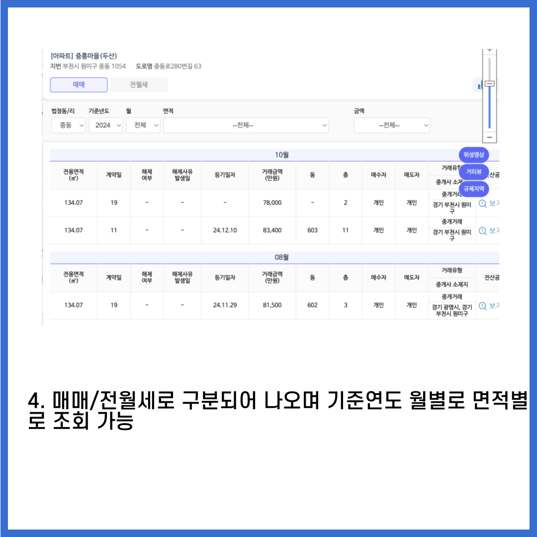 • 매매뿐 아니라 전월세 거래 내역도 확인 가능.