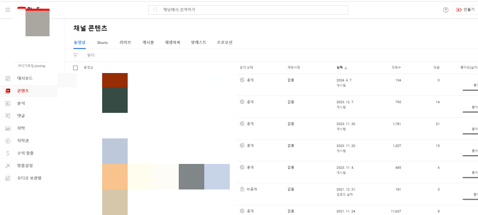1. 내채널 - 콘텐츠에 들어가면 아래와 같은 화면이 뜹니다.