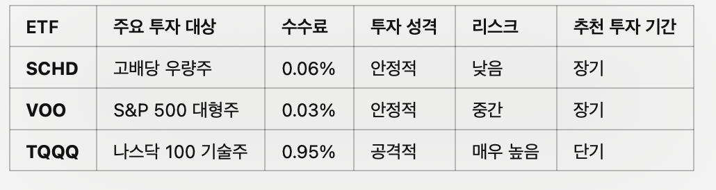 #SCHD #VOO #TQQQ #ETF비교 #해외주식투자 #미국ETF #배당투자 #S&P500 #레버리지ETF #장기투자 #단기투자 #ETF추천