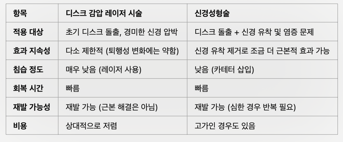 안녕하세요 주린더입니다. 퇴행성 변화와 디스크 문제가 복합적으로 진행된 상태에서 두 가지 주요 치료법인 디스크 감압 레이저 시술과 신경성형술의 장단점과 차이점을 아래에서 비교해 드릴게요.